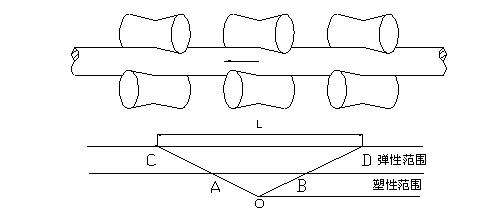 縱向彎曲矯直是使42CrMo無縫鋼管產(chǎn)生與彎曲相反方向的塑性變形來達(dá)到矯直彎曲的目的,而不彎曲的管子斷面只產(chǎn)生彈性變形,塑性變形區(qū)占支撐距的40%長度,如圖1.5所示。