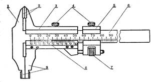 6一主尺;7一微動(dòng)螺母;8一游標(biāo);9—下量爪