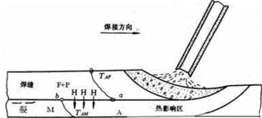 如圖所示,高溫下,焊接熱影響區(qū)都是奧氏體,隨著熱源移走,由于焊縫的含碳量低于母材,所以焊縫在較高溫度下就發(fā)生相變,也就是奧氏體分解為鐵素體和珠光體。由于母材的含碳量較高,所以熱影響區(qū)金屬還沒有開始奧氏體分解。當(dāng)焊縫由奧氏體轉(zhuǎn)變?yōu)殍F素體、珠光體等組織時(shí),氫的溶解度突然下降,而氫在鐵素體、珠光體中的擴(kuò)散速度很快,因此氫就很快的從焊縫越過熔合線向尚未發(fā)生分解的奧氏體影響區(qū)擴(kuò)散由于氫在奧氏體中的擴(kuò)散速度較小,不能很快把氫擴(kuò)散到距熔合線較遠(yuǎn)的母材中去,因而在熔合線附近就形成了富氫地帶。當(dāng)滯后相變的熱影響區(qū)由奧氏體向馬氏體轉(zhuǎn)變時(shí),氫便以過飽和狀態(tài)殘留在馬氏體中,促使這一地區(qū)進(jìn)一步脆化。如果這個(gè)部位有缺口效應(yīng),并且氫的濃度足夠高時(shí),就可能產(chǎn)生根部裂紋或焊趾裂紋。若氫的濃度更高,可使馬氏體更加脆化,也可能產(chǎn)生焊道下裂紋。